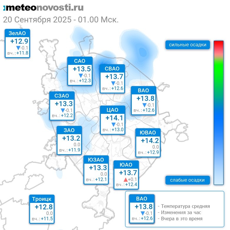 В 1:00 в Москве было от +12.4°C до +14.4°C, средняя температура +13.6°C #погода #Москва #осень #температура #20сентября #суббота