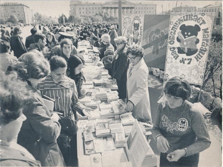 Книжный базар в Чите во время литературного праздника «Забайкальская осень — 79». Надпись на плакате: «Вас обслуживает магазин № 7» Фото: Григорий Калачьян. ЧВК Чита в ВКонтакте