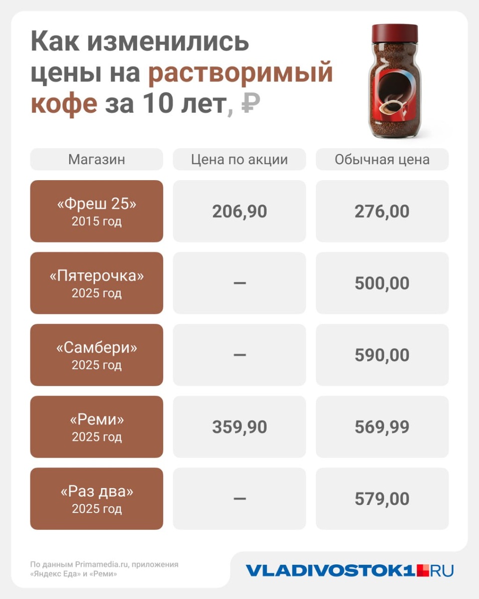 За 10 лет стоимость разных продуктов выросла в несколько раз, например, сахар подорожал почти на 40%, а сгущенное молоко - на 377%. В этот раз VLADIVOSTOK1.RU сравнил цены на растворимый кофе в 2015 году и сейчас. Разница - в среднем 94%. Подробнее в материале. 🔲Подписаться | Предложить новость
