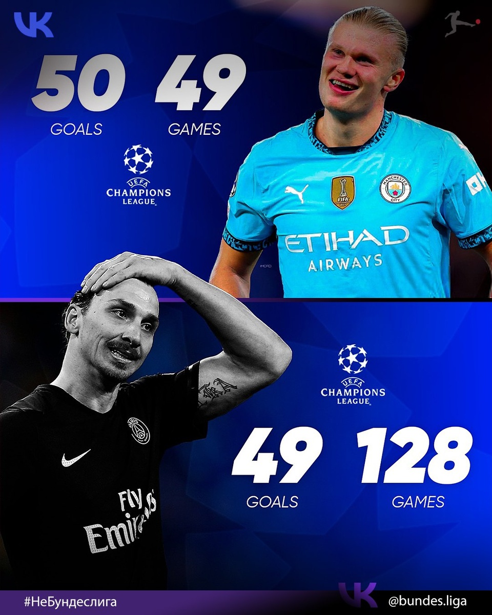 ⚡ Ибрагимович теперь позади Холланда! Нападающий «Манчестер Сити» забил «Наполи» свой юбилейный гол в ЛЧ 🏆 Теперь на счету норвежского футболиста 50 забитых мячей в 49 матчах Лиги чемпионов. Холланд достиг этой отметки быстрее всех🚀: Руд ван Нистелрою потребовались 62 игры, а Лионелю Месси – 66. Кроме того, Эрлинг сравнялся с Тьерри Анри по голам в этом соревновании. Список лучших бомбардиров в истории Лиги чемпионов: 1. Криштиану Роналду – 140 голов (183 матча) 2. Лионель Месси – 129 голов (163 матча) 3. Роберт Левандовски – 105 голов (133 матча) 4. Карим Бензема – 90 голов (152 матча) 5. Рауль – 71 гол (142 матча) 6-7. Килиан Мбаппе – 57 голов (88 матчей) 6-7. Томас Мюллер – 57 голов (163 матча) 8. Руд ван Нистелрой – 56 голов (73 матча) 9-10. Тьерри Анри – 50 голов (112 матчей) 9-10. Эрлинг Холанд – 50 голов (49 матчей) Это наша рубрика #НеБундеслига, где будут интересные моменты мирового футбола ✍