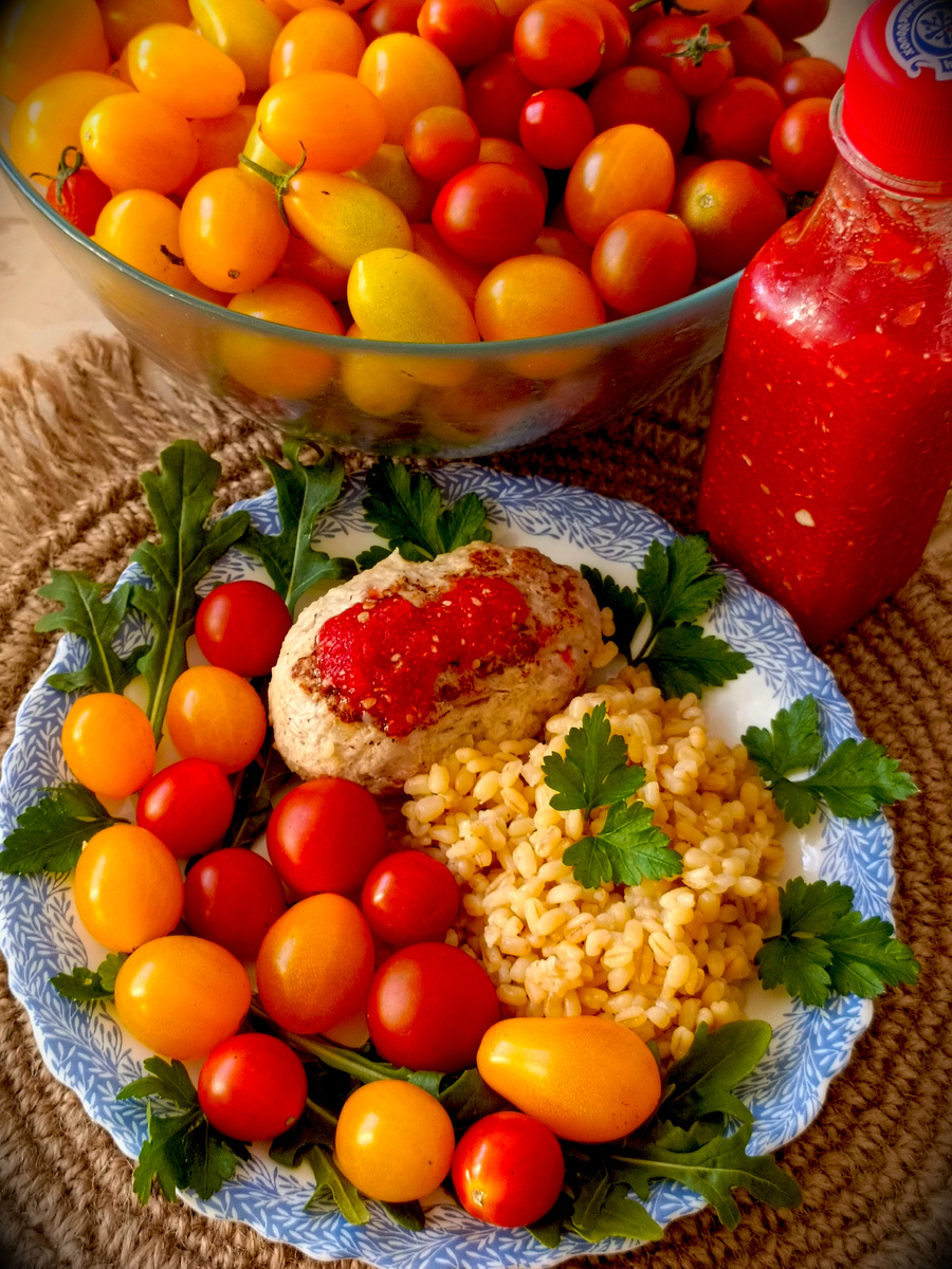 Сегодня котлеты с булгуром приготовленные по всем правилам здорового питания! Я стараюсь следовать "правилу тарелки" : половина - это овощи, клетчатка, четверть - белок, и ещё четверть - сложные углеводы. В фарш из куриной грудки я добавила лук, кабачок и творог - это придаст котлетам сочности и пользы. Сформировала аппетитные котлетки, слегка обжарила с одной стороны на чуть смазанной маслом сковороде. Затем перевернула их, подлила водички , присолила и, чтобы сделать блюдо ещё более сытным всыпала пару ложек булгура. Все это тушилось вместе превращаясь в одно замечательное блюдо " два в одном". Получилось четыре котлеты, которые я разделила на четыре приема пищи и две порции булгура. Это два обеда и две котлеты на два ужина. На ужин я стараюсь избегать круп, поэтому эти котлеты да с овощным салатом будут идеальным вариантом для ужина. В итоге получился не только невероятно вкусный, но и очень полезный обед, который зарядил меня энергией на весь день! Ещё добавила для остроты на к