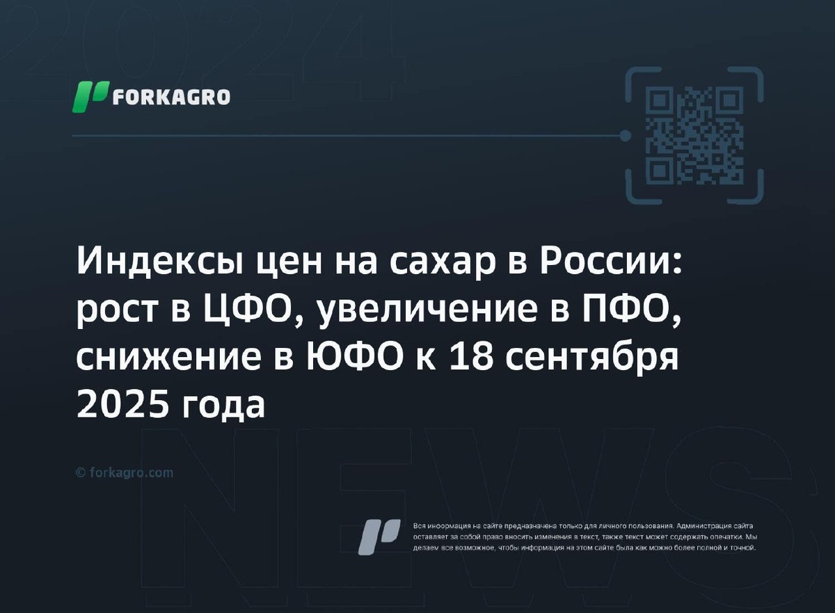 Индексы цен на сахар в России: рост в ЦФО, увеличение в ПФО, снижение в ЮФО к 18 сентября 2025 года