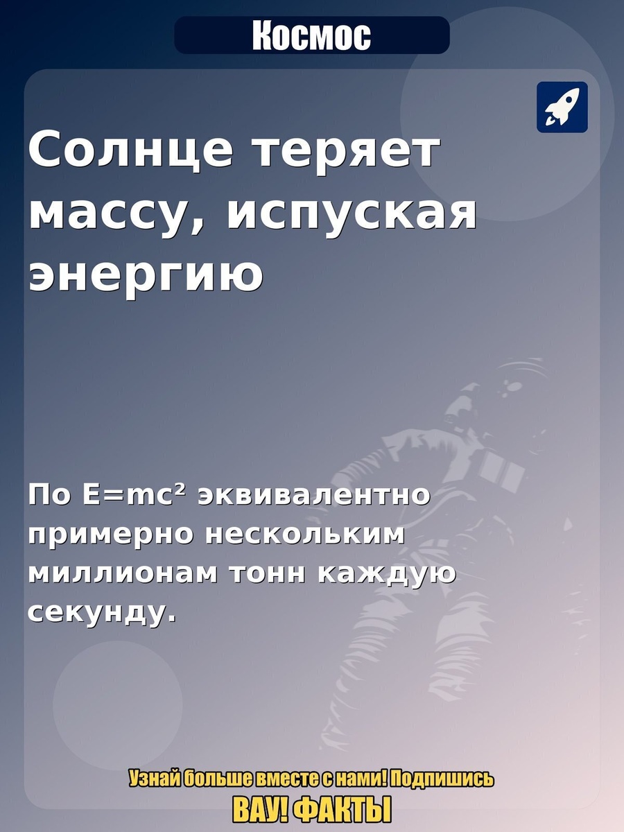 Солнце теряет массу, испуская энергию. По E=mc² эквивалентно примерно нескольким миллионам тонн каждую секунду. Интересный факт по теме «Космос»: Солнце теряет массу, испуская энергию. Почему так: По E=mc² эквивалентно примерно нескольким миллионам тонн каждую секунду.. Поделитесь в комментариях, знали ли вы об этом и стоит ли делать продолжение по теме. #космос #факты #астрономия