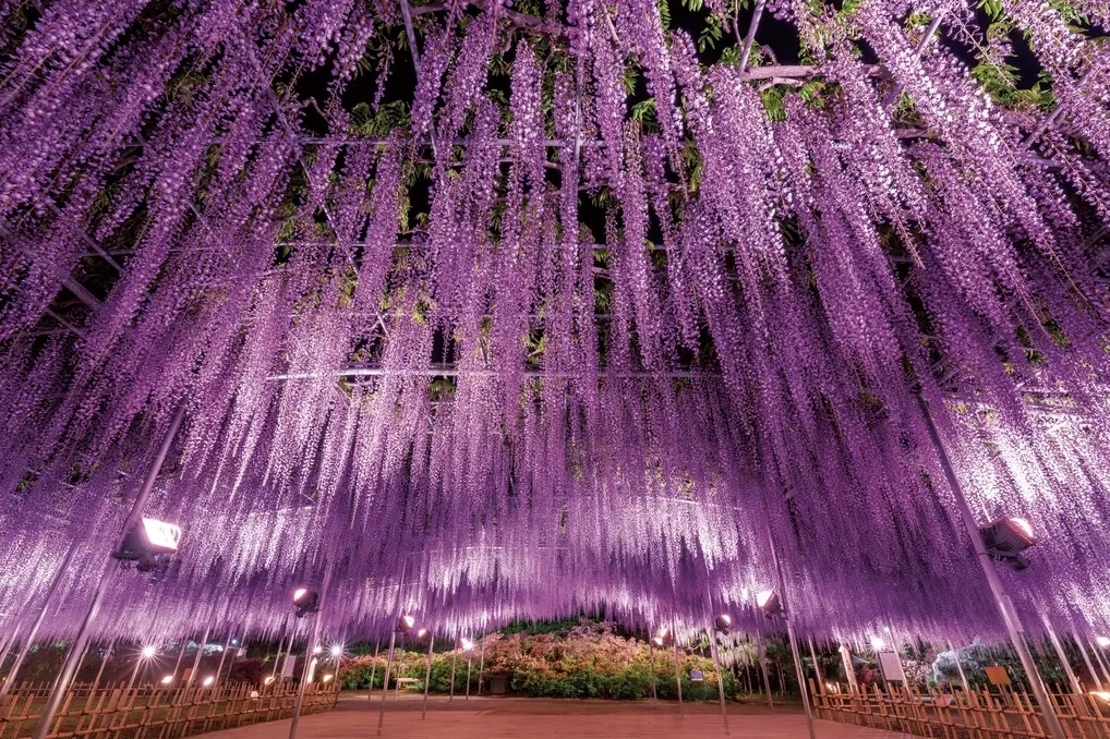 Глицинии выращивают на подвесных каркасах, поэтому их цветы свисают над головой, словно сталактиты. Красивые днем, они также ночью подсвечиваются огнями. Глициния в парке цветов Асикага обычно цветет в начале мая, на одну-две недели позже, чем в Токио.