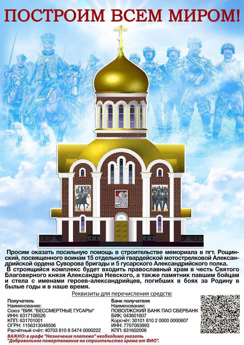 В России храмы всегда строились, как у нас принято говорить, «всем миром». Особой любовью и почитанием пользовались памятники и храмы, связанные с подвигами русских воинов. Например, Шипкинский монастырь или Храм Рождества Христова в память воинов, погибших при освобождении Болгарии от турецкого ига. Строительство этих и многих других храмов было всенародным делом, средства поступали от гражданских и военных организаций, от жителей конкретного города и всей страны. Такие примеры говорят о трепетном отношении русского народа к памяти павших героев. Ибо нет большей любви, чем отдать жизнь за други своя. Вот и теперь настало время всем миром запечатлеть подвиг офицеров и солдат гвардейской Александрийской бригады, вставших на защиту нашей страны и освобождающих землю Новороссии от украинского нацизма. В посёлке Рощинский - в месте постоянной дислокации бригады - будет построен мемориальный комплекс, посвященный воинам 15-й отдельной гвардейской мотострелковой Александрийской ордена Сув