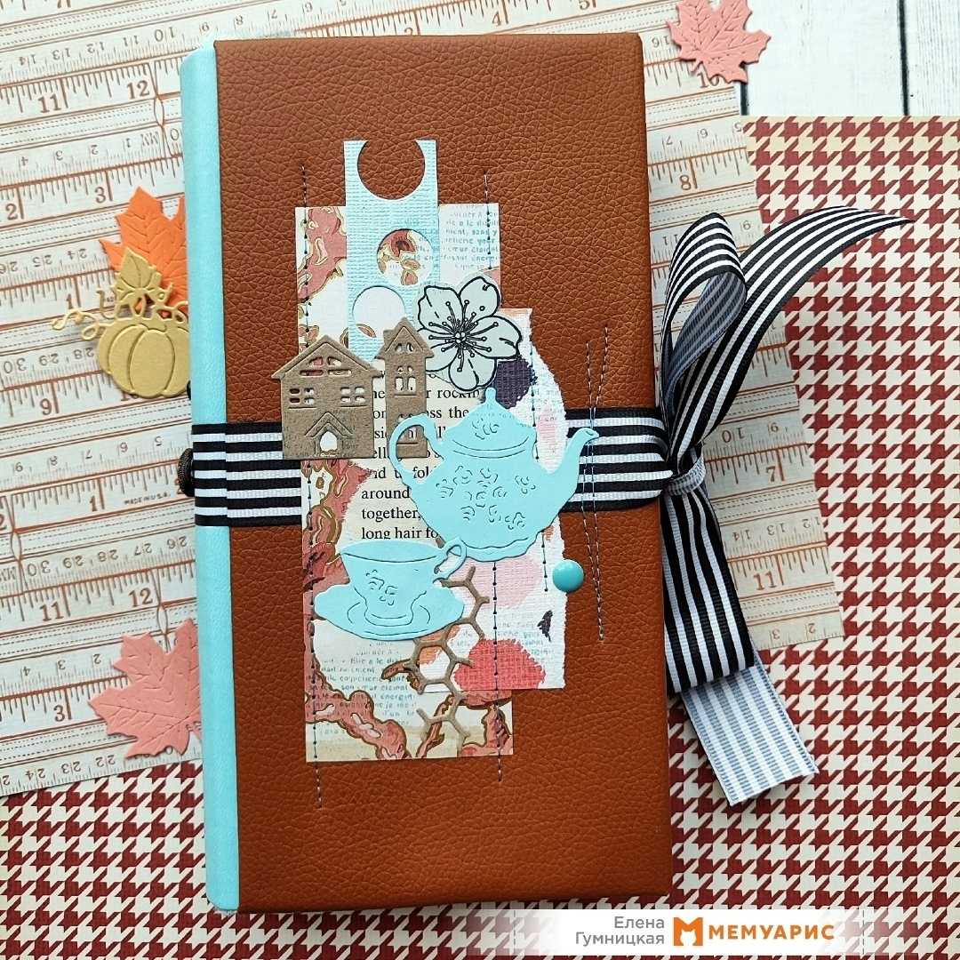 Где в каждом доме можно найти не только осенний натюрморт, а, пожалуй. любой? Правильно, на кухне! Я, Елена Гумницкая, приглашаю вас к себе на осеннюю кухню. В нашей семье все и всегда вкусно готовили, вот и я тоже не исключение очень люблю готовить, а печь вкусняшки могу круглый год каждый день. Осенью это желание как-будто обостряется, наверное из-за того, что урожай на огороде собран и можно кайфовать от красоты за окном, попивая вкусный чай с ароматным пирогом. Вот поэтому я очень хочу сделать семейную кулинарную книгу, в которой будут записаны любимые рецепты еще от наших бабушек. Начну враскачку с небольшого кулинарного блокнота для выпечки в теплых, осенних цветах. Выбрала формат 10,5 см на 21 см, обложка обтянута кожзамом красивого осеннего цвета, и она так здорово сочетается с голубым корешком, и полосатой лентой. На обложке красуются голубые чайничек с чашечкой Mimi cut. Вырубка домики и негатив, штампинг цветок, кусочки бумаги и книжного листа, маленькая голубая капелька дот