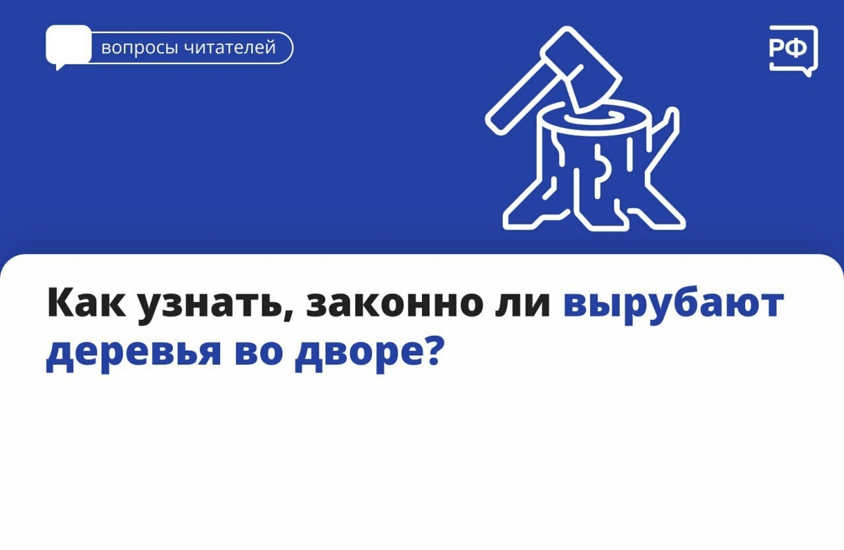 ❓Все растения на территории многоквартирного дома считаются общедомовым имуществом. За них отвечает УК или ТСЖ. Если вы увидели, что во дворе вырубают деревья или кустарники, запросите у управляющей организации порубочный билет — специальное разрешение, которое выдают в местной администрации. Если такого разрешения нет, вы можете пожаловаться на УК или ТСЖ в администрацию района и прокуратуру. 👉За незаконную вырубку деревьев и кустарников грозит штраф: • от 3000 до 4000 рублей для физических лиц; • от 20 000 до 40 000 рублей для должностных лиц; • от 200 000 до 300 000 рублей для юридических лиц. Больше полезных материалов смотрите на Объясняем.РФ