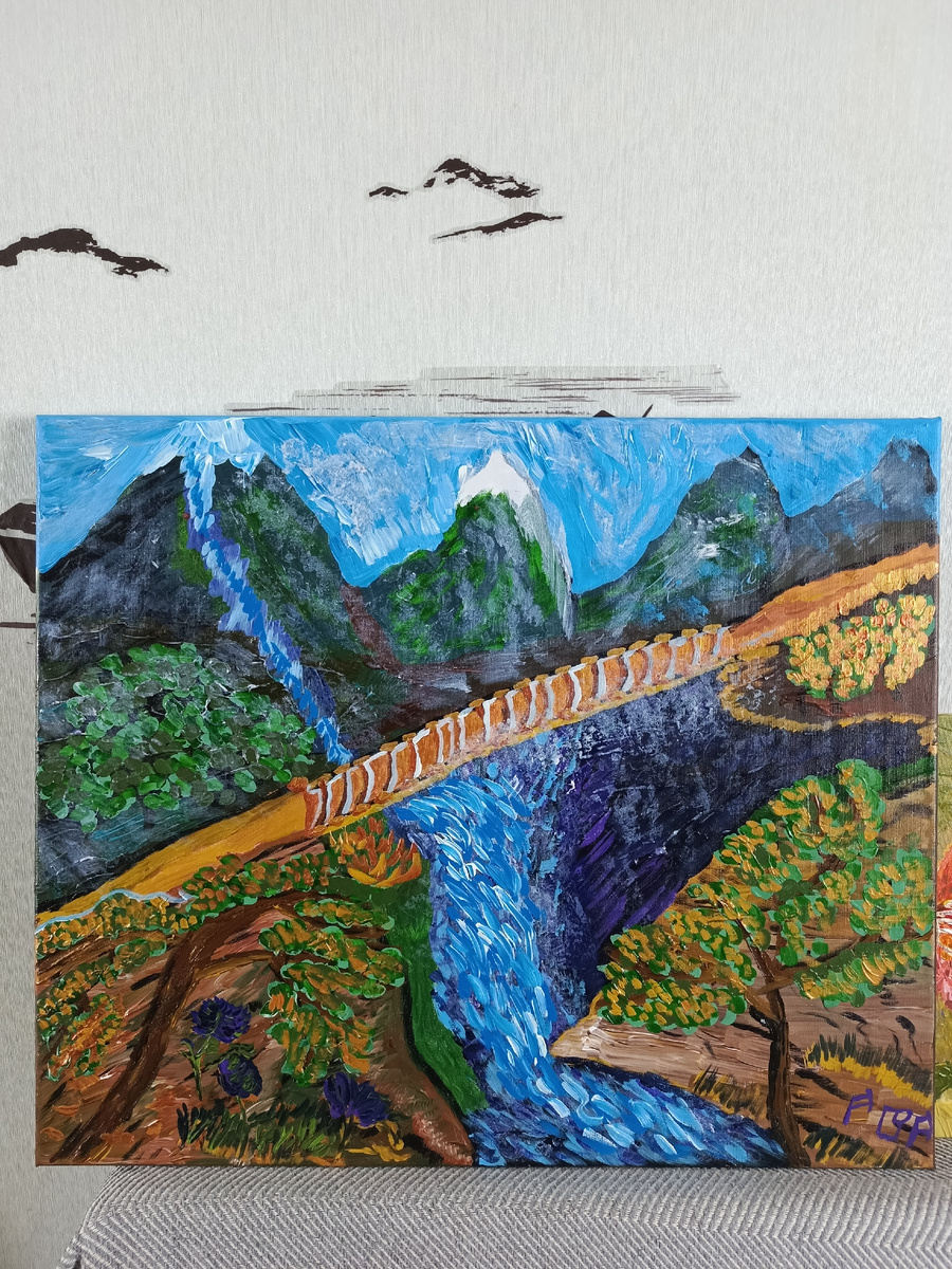Картина «Туманная тропа» художника Романа Милютина (Моран) — это волшебное путешествие в мир, где природа оживает с неповторимой энергией и глубокой эмоциональностью. Созданная в стиле вэйдха-абстрактного импрессионизма, она сочетает узнаваемые образы с чувственным подходом к цвету и свету, будто вы видите пейзаж через призму настроения, а не просто глазами. На полотне предстаёт живописный горный ландшафт, где каждый элемент словно дышит своей собственной жизнью. В центре композиции — деревянный мост*э, перекинутый через стремительную реку. Он выглядит как тонкая нить, соединяющая два берега, но при этом — прочный и надёжный, словно символ пути, который нужно пройти. Мост изображён в тёплых охристых тонах с белыми опорами, они почти мерцают, будто подсвечены внутренним светом. Под мостом — река, которая бурлит и сверкает. Художник использовал яркие оттенки синего и бирюзового, добавив всплески белого и голубого, чтобы передать движение воды. Кажется, что она не просто течёт, а по