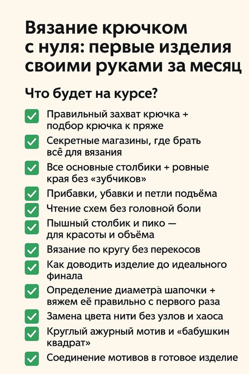 Дорогая моя рукодельница, а может продолжим вязальное путешествие?😌 Ведь вы уже попробовали первые шаги крючком и почувствовали, как приятно создавать красоту своими руками. Теперь самое время пойти дальше и связать свои первые полноценные изделия! 📍Приглашаю вас на курс «Вязание крючком с нуля: первые изделия своими руками за месяц» За 4 недели вы: ➡ Научитесь делать прибавки и убавки, чтобы изделия выглядели идеально. ➡ Освоите чтение схем без головной боли. ➡ Попробуете «пышный столбик» и его вариации для красоты и объёма. ➡ Свяжете по кругу аккуратно и без загибаний. ➡ Определите диаметр шапочки и сможете связать её без переделок. ➡ Научитесь менять цвет нити и создавать яркие проекты. ➡ Освоите «бабушкин квадрат» и соединение мотивов в настоящие авторские вещи. И всё это в удобном формате: уроки в записи, доступ НАВЕЧНО, можно идти в своём темпе. 🎁 Плюс для вас приготовлены бонусы: ✔️ Брошюра «Мерсеризованный хлопок» ✔️ Брошюра «Крючки для вязания: виды и выбор» ✔️ Брошю