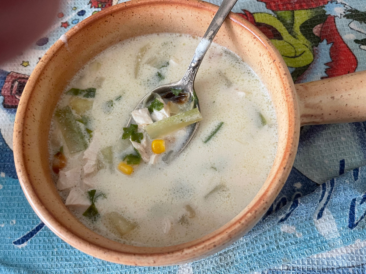 Ингредиенты: куриное филе - 400 гр., 1 литр куриного бульона, 200гр. консервированных (или свежих) зерен кукурузы, 1 луковица, 2 черешка сельдерея, 2 крупные картофелины, 4 веточки Петрушки, 1/2 чайной ложки тимьяна, 2 ст.ложки муки, 200 мл. Сливок 20%, растительное масло для обжаривания , соль, перец по вкусу. Приготовление: куриное филе смазать растительным маслом, посолить, поперчить, положить на противень для запекания . Поставить в разогретую до температуры 200 градусов на 10 минут. Затем вынуть, накрыть фольгой и оставить пока готовятся овощи. Лук измельчить, сельдерей нарезать тонкими дольками, картофель средними кубиками, петрушку измельчить. В кастрюле разогреть растительное масло, положить лук, обжарить на среднем огне до мягкости минут 7. Обжарить сельдерей и готовить еще 5 минут. Положить картофель, закрыть крышкой и готовить помешивая 10 минут, всыпать тимьян и петрушку. Смешать муку со сливками до однородности. Добавить куриный бульон или вод