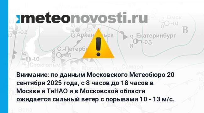 Внимание: по данным Московского Метеобюро 20 сентября 2025 года, с 8 часов до 18 часов в Москве и ТиНАО и в Московской области ожидается