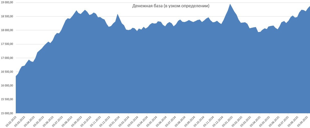 Нала в России всё больше Рост на 0,4% за неделю Денежная база в узком определении включает выпущенные в обращение Банком России наличные деньги (с учетом остатков средств в кассах кредитных организаций — резидентов Российской Федерации) плюс остатки средств на счетах обязательных резервов, депонируемых кредитными организациями — резидентами Российской Федерации в Банке. Более 90% — это нал. Удобно, что еженедельно на сайте ЦБ публикуют узкую базу cbr.ru/hd_base/mb_nd/mb_nd_weekly/ С начала 2024г., корреляция узкой денежной базы с USDRUB = 0,84 (очень высокая) Рост с июня 2025г. За 3 мес. рост 3,2% За неделю с 5 по 12 сентября рост 0,4%