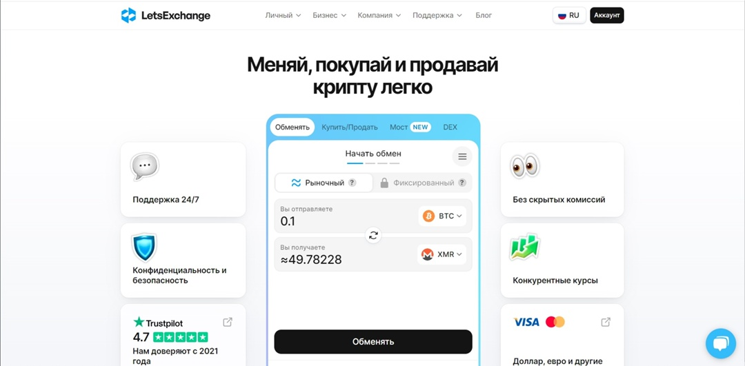 Платформа поддерживает операции с более чем 80 фиатными валютами , включая основные мировые валютные и международные платежные системы. Особое внимание уделено пристальному вниманию с помощью платежных цепочек , что делает LetsExchange точным выбором для российских пользователей.