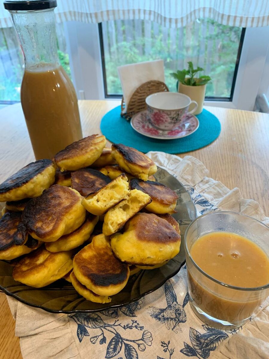 Оладьи тыквенные 🎃 200 г тыквенное пюре 🎃 300 г кефир 🎃 2 яйца 🎃 3 ст.л сахара 🎃 2/3 ч.л. соли 🎃 460 г пшеничной муки в/с 🎃 1 ч.л. соды Технология. В сотейнике смешать кефир и пюре, прогреть до тёплого состояния. Внести Сахар, соль и яйца. Венчиком смешать до однородности, не взбивая в пену. Внести всю муку и смешать венчиком всегда в одном направлении до гладкости теста. Не взбивать, чтобы не образовывались пузыри воздуха. На последнем этапе внести соду, объединить соду с тестом. Оставить на 15 минут. Разогреть сковороду на среднем огне, налить масло, чтобы покрыло дно. Прогреть. Столовой ложкой зачерпывать тесто по стенке посуды, стараясь не нарушать общего покоя теста. Жарить под крышкой на огне чуть ниже среднего до матовой верхней поверхности оладья и до румяности нижней. Снять крышку, перевернуть вилкой, убавить чуть газ и довести до румяности вторую сторону. Вновь прибавить газ, дать набрать температуру, при необходимости добавить масло. Таким манером приготовить