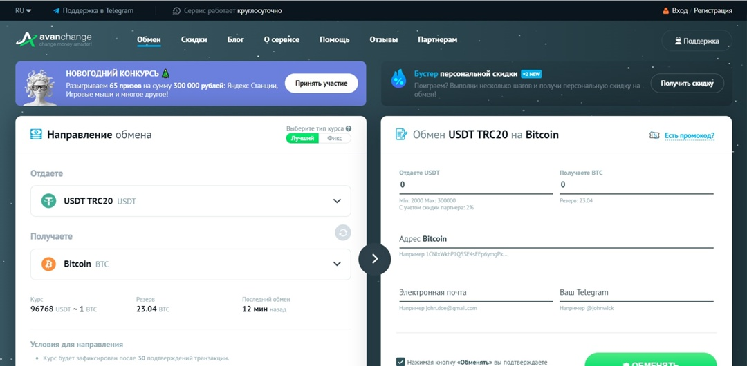 AvanChange — это автоматический обменник криптовалют, предоставляющий пользователям возможность быстрого и безопасного обмена цифровых активов на фиатные валюты и обратно. Платформа поддерживает более 60 криптовалют, включая Bitcoin, Ethereum, Monero, USDT и другие популярные активы, а также работает с традиционными платежными системами.