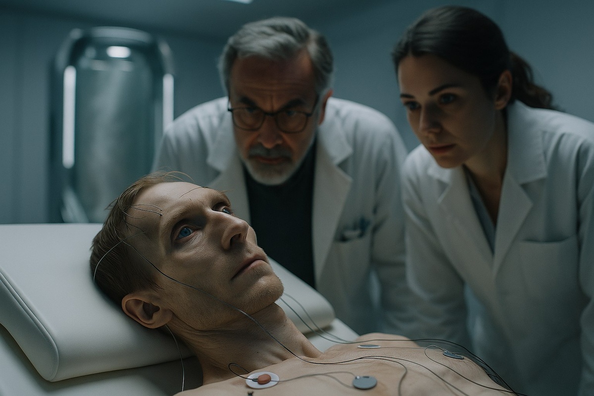Над человеком склонились двое. Седовласый, с энергичным, проницательным взглядом профессор Аркадий Львович Громов, и его молодая ассистентка, доктор Елена Соколова.