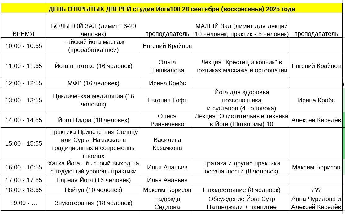 Уже через 8 дней! День Открытых Дверей в Йога108 Приветствуем, друзья 👌 28 сентября встречаемся на Дне Открытых Дверей в студии Йога108! Вас ждут: 🟢Более 10 мастер-классов от преподавателей и гостей студии. 🟢Возможность попробовать разные направления йоги. 🟢Атмосфера единства, вдохновения и радости! 🙏Билеты уже доступны: 1 занятие - 260 ₽ 3 занятия - 730₽ 6 занятий - 1350₽ Весь день (10 занятий) - 2060₽ Количество мест ограничено, успейте забронировать! 🙏Купить билеты можно у администратора в студии или на сайте (раздел СТОИМОСТЬ → мастер-классы → день открытых дверей). Проведите этот день в кругу йогов и энергии практики! ОМ ШАНТИ ШАНТИ ШАНТИ ✨