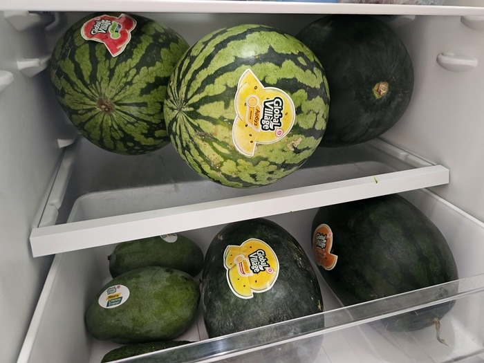 В последние годы все больше и больше на прилавках наших магазинов появляются сомнительные арбузы разных цветов, форм и размеров. Стоит ли их пробовать? Или продолжать брать арбузы с нашего юга? Прежде всего меня такие арбузы привлекают своим размером. Классический для меня слишком большой, его не успеваешь съесть и он портиться. А эти небольшие, по 2-3кг, что крайне удобно как для хранения в холодильнике, так и для разового поедания. В моей пятерке их было пять штук, отличаются от классики они названием и ценой, все примерно по 70 рублей за кг. Первым было решено съесть "оранжевый свежий" и это был самый невкусный арбуз. Точнее, он был вообще безвкусным и с еле ощутимым запахом тыквы. Возможно, слово свежий в названии говорит о том, что он не спелый, но есть его было невозможно. Вторым под нож пошел желтый, единственный арбуз, который сразу продовался со скидкой и стоил 30 рублей за кг. Этот оказался чуть вкуснее оранжевого, легкий привкус арбузной слодости в нем ощущался, но не более.
