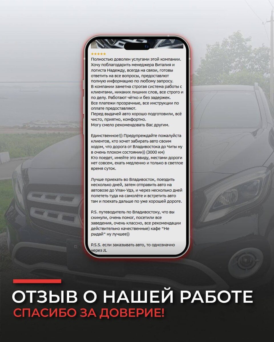 ОТЗЫВЫ О НАШЕЙ РАБОТЕ Привезли для нашего клиента из Томской области Mercedes GLA180 и получили отличный отзыв: "Полностью доволен услугами этой компании. Хочу поблагодарить менеджера Виталия и логиста Надежду, всегда на связи, готовы ответить на все вопросы, предоставлют полную информацию по любому запросу. В компании заметна строгая система работы с клиентами, никаких лишних слов, все строго и по делу. Работают чётко и без задержек. Все платежи прозрачные, все инструкции по оплате предоставляют. Перед выдачей авто хорошо подготовили, всё чисто, приятно, комфортно. Могу смело рекомендовать Вас другим. Единственное!)) Предупреждайте пожалуйста клиентов, кто хочет забирать авто своим ходом, что дорога от Владивостока до Читы ну в очень плохом состоянии)) (3000 км) Кто поедет, имейте это ввиду, местами дороги нет совсем, ехать медленно и только в светлое время суток. Лучше приехать во Владивосток, поездить несколько дней, затем отправить авто на автовозе до Улан-Удэ, и через нескольк