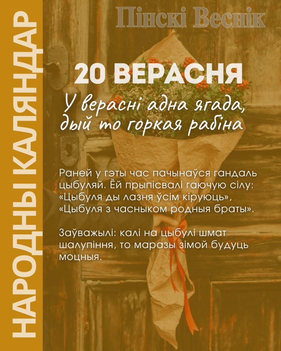 📎📎📎📎📎🔺📎📎📎📎 📎📎📎📎📎📎🔺📎📎📎📎 🔵20 верасня ✏️Раней у гэты час пачынаўся гандаль цыбуляй. Ёй прыпісвалі гаючую сілу: «Цыбуля ды лазня ўсім кіруюць», «Цыбуля з часныком родныя браты». 🪶Заўважылі: калі на цыбулі шмат шалупіння, то маразы зімой будуць моцныя. 📍📍@Пинский Вестник ЮТУБ | САЙТ| ИНСТ | ВК | ОК | ФЕ | Прислать новость