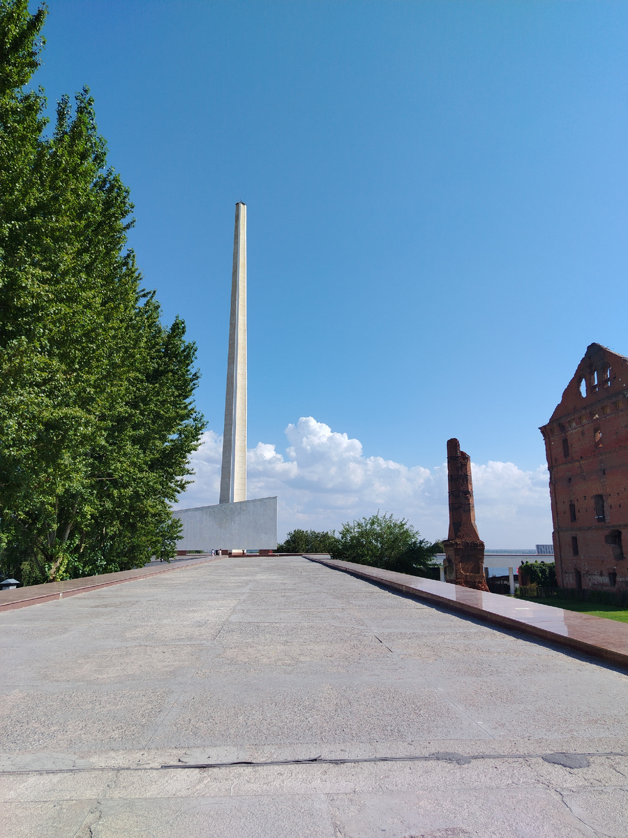 Над музеем-панорамой «Сталинградская битва» высится белый обелиск. Его называют «штыком» , поскольку выполнен он в виде трехгранного штыка русской винтовки. Металлическая основа обелиска изготовлениа на заводе «Волгостальмонтаж» и облицована, как и ротонда панорамы, белым известняком. Высота «штыка» – 75 метров, а от уровня земли он поднимается на целых 80, являясь одним из самых высоких сооружений Волгограда. Вокруг шпиля вьётся эстакада, соединяющая верхний и нижний уровни музейного комплекса. В 2005 году специалисты промышленной группы «Вертикаль» сделали подарок музею к 60-летию Победы в Великой Отечественной войне – за 10 дней они полностью отреставрировали шпиль. Работать им приходилось условиях «качки» : колебания шпиля достигают 60 сантиметров. Подписывайтесь на мой канал! И будем гулять вместе с удовольствием!