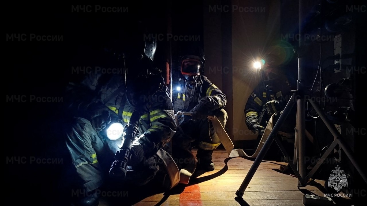 Огнеборцы действовали в среде, непригодной для дыхания, включив дыхательные аппараты. Звенья газодымозащитников вошли в здание центра. Когда возгорание происходит на объекте, где может находиться большое количество людей – уровень сложности возрастает. Первоочередная задача личного состава при работе на таком пожаре – спасение людей. Согласно поступившей вводной, в зрительном зале и на сцене могли находиться люди. В ходе разведки там были обнаружены два человека, взрослый и ребёнок. Используя подключенные к дыхательным аппаратам газодымозащитников, спасательные капюшоны, они были эвакуированы из здания на улицу, где им оказали первую помощь. К зданию центра также прибыли сотрудники Специализированной пожарно-спасательной части, ПСЧ-1, 3, службы пожаротушения.