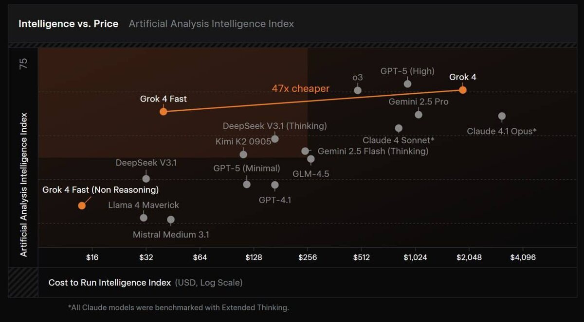 ❎ xAI официально представила Grok 4 Fast. Эта новая нейросеть в 47 раз дешевле базовой модели и по некоторым бенчмаркам даже превосходит обычный Grok 4 (хотя не по всем показателям). Контекстное окно составляет 2 миллиона токенов, что позволяет вместить четыре тома «Войны и мира». Для ускорения ответов модель может пропускать размышления в задачах, требующих быстрого решения. В рейтинге LMArena, где ответы ИИ сравниваются вслепую, Grok 4 Fast занял 8-е место, сопоставимое с Grok 4, Claude Opus 4 и Qwen3-235B-A22B (2507), а на арене Web-Search — 1-е место. 🔠Попробовать можно бесплатно на Grok.com или в X. #xAI #Grok4Fast #Нейросети #ИскусственныйИнтеллект #Технологии #Модели #LMArena #WebSearch #Бесплатно #Инновации