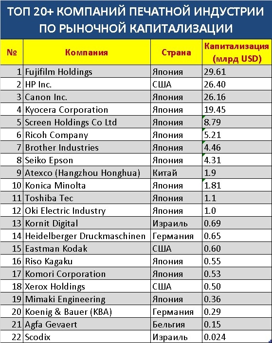 Вчера я решил сделать то, чего ещё никто в мире не делал. Засиделся за таблицей до поздней ночи. Создал таблицу самых крупных компаний мировой печатной индустрии по рыночной капитализации. Уже глубокой ночью у нас, выложил её в LinkedIn буквально 7 часов назад — пост уже набрал десятки тысяч просмотров, сотни лайков и десятки комментариев. В посте я просто разместил таблицу с вопросом: «Ребята, кого ещё крупного и важного я упустил?» И действительно, оказалось, что я пропустил пару значимых компаний. Так что встречайте обновлённую версию таблицы — v1.1. Наслаждайтесь! Принцип Парето в действии! Первым делом размещаю посты тут — https://t.me/sergeybelokurovinkjet
