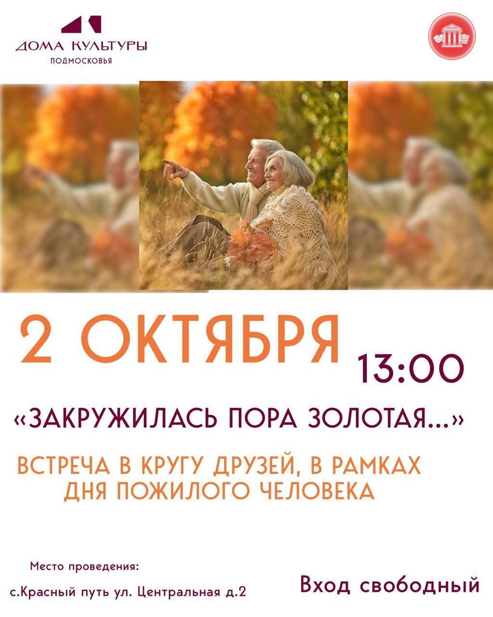 ✨ СДК «Русь» приглашает ‼️ 🍁🍂🍁🍂🍁🍂🍁 «Закружилась Осень золотая» - встреча в кругу друзей, посвященная Дню пожилого человека 🍁🍂🍁🍂🍁🍂🍁 В программе: • чаепитие в кругу друзей; •любимые песни под баян; • хоровой коллектив «Кружева»; • поздравления от правления. 🍁🍂🍁🍂🍁🍂🍁 Людям старшего поколения иметь при себе социальную карту. 📆 02.10.2025🕒13:00 🏢 Сельский дом культуры (СДК) «Русь» 📍 г.о.Домодедово, с.Красный Путь, ул.Центральная, д.2 💰 Вход свободный❗️ ✅ Мероприятия Домодедово https://dzen.ru/id/66f10385cc4c5a16f7b5fb02 http://vk.com/domodedovo_events http://dzen.ru/domodedovo_events