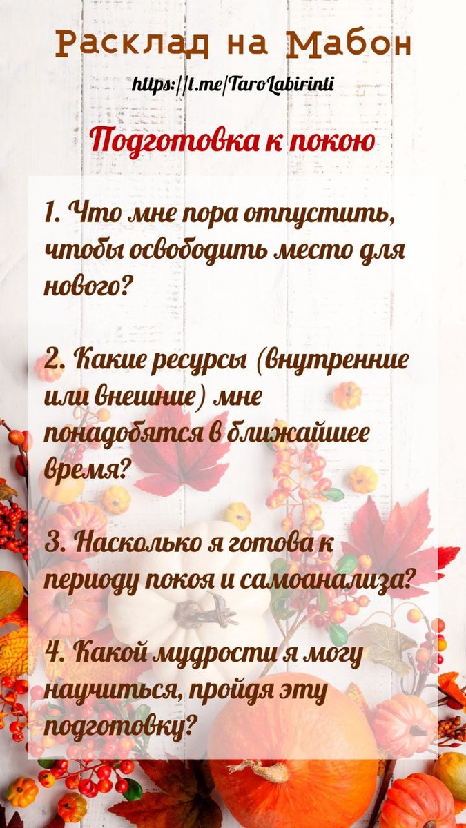 🍁Расклад: “Подготовка к Покою”🍁 Готовимся к Переменам: Что Отпустить на Мабон? 🎃 Мабон – это не только праздник равновесия, но и время, когда мы начинаем готовиться к периоду покоя и внутренней трансформации. Природа замедляется, и нам тоже важно обратить внимание на то, что уже отслужило свой срок, чтобы освободить место для нового. 🎃 Этот расклад поможет вам определить, что пора отпустить, какие ресурсы вам понадобятся, оценить свою готовность к самоанализу и понять, какую мудрость вы можете извлечь из этого переходного периода. ❓Что именно мы анализируем этим раскладом: Этот расклад фокусируется на переходе от активной фазы к более созерцательной, характерной для приближающейся зимы. 🎃 Он помогает идентифицировать ненужный “груз” – вещи, мысли, отношения, привычки, которые мешают движению вперед. 🎃 Также исследуются внутренние и внешние ресурсы, которые будут поддерживать в период самоанализа, и оценивается степень готовности к этому внутреннему процессу. 🎃Главная ц