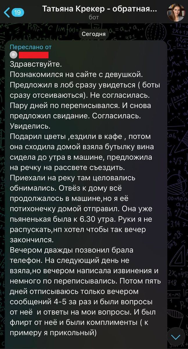 В бота пришло сообщение (анонимно)👆 Поскольку вопроса/запроса нет, то порассужаю. Мужчина вложился: цветы, свидание, рассвет, романтика. Она получила от него крутые эмоции и… слилась. Такое бывает, увы. Однако, не стоит принимать чужие тараканы на свой счет. 🔥 Мой совет: - Не бегать за ней [этот мужчина правильно рассуждает]. Он уже сделал шаги. Ответа нет. Значит, интерес не закрепился. - Не путать флирт и интерес. Ее смайлики и шуточки - легкий эмоциональный выброс. Не факт, что за ним стоит желание строить отношения. - Учесть опыт: слишком много вкладываться в начале - опасно. Надо держать баланс. Она должна тоже вкладываться. - Двигаться дальше и знакомиться с девушками. Очень быстро такие «странные истории» исчезают, когда есть несколько вариантов, выбор. И главный момент: ❗️Не позволяй ни одной женщине пошатнуть твою уверенность. Пс.: Если она появится - общаться спокойно, без прежнего рвения. С позиции: «Я классный, у меня своя жизнь. Хочешь - вписывайся»