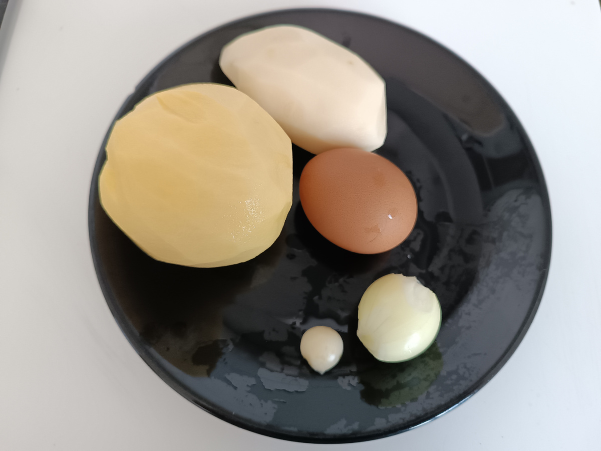 Картофель, лук и чеснок измельчаем в блендере, добавляем яйцо, соль перец.