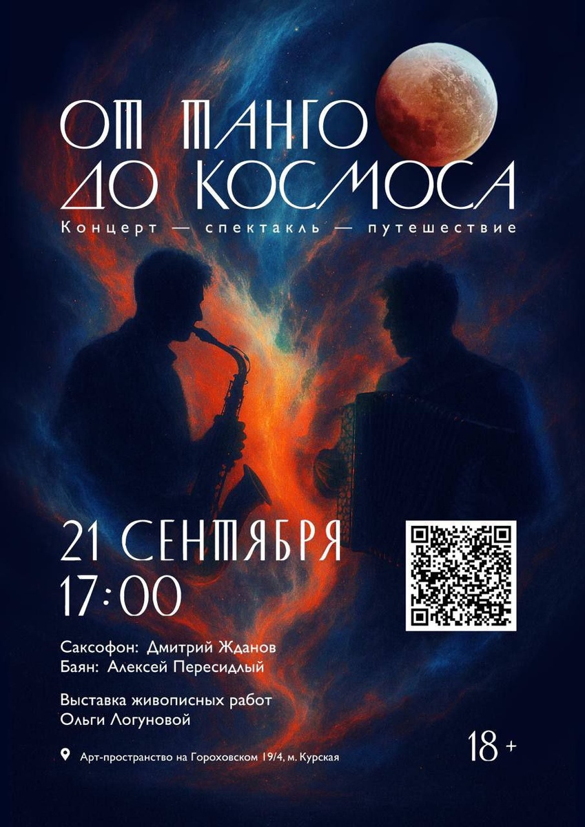 Танцы, музыка и живопись – три самостоятельных вида искусства, которые тесно взаимосвязаны. Которые вдохновляют друг друга, слившиеся воедино на концерте «ОТ ТАНГО ДО КОСМОСА» Дуэт ESPOZITO — это философское исследование вечного диалога между земным и возвышенным! 🎭 🖼️ 🎵❤️ Два виртуозных мастера: 🔹 Баян - Алексей Пересидлый (Ханты-Мансийск) 🔹Сакс - Дмитрий Жданов (Москва) Уникальные музыканты с бешеной энергией и харизмой. 🔹Выставка живописных работ Ольги Логуновой Современная художница. На ее «страницах» - «работах» фантазии, личные переживания и жизненные обстоятельства, вплетенные в реальные и вымышленные сюжеты, в то же время подчеркивая вечную актуальность человеческих эмоций и красоты. Театральная Компания MAXIMUM Скромная персона @art_tnua В качестве куратора. 📆 21 сентября вс 17.00 🏛 Флигель усадьбы В.А. Лемана XIXв. Камерный зал 📍Гороховский пер 19с4 Купить билеты по ссылке https://semeinyi-sud.timepad.ru/event/3572911 ❗️Промокод LITLAB на -30% Будем рады в