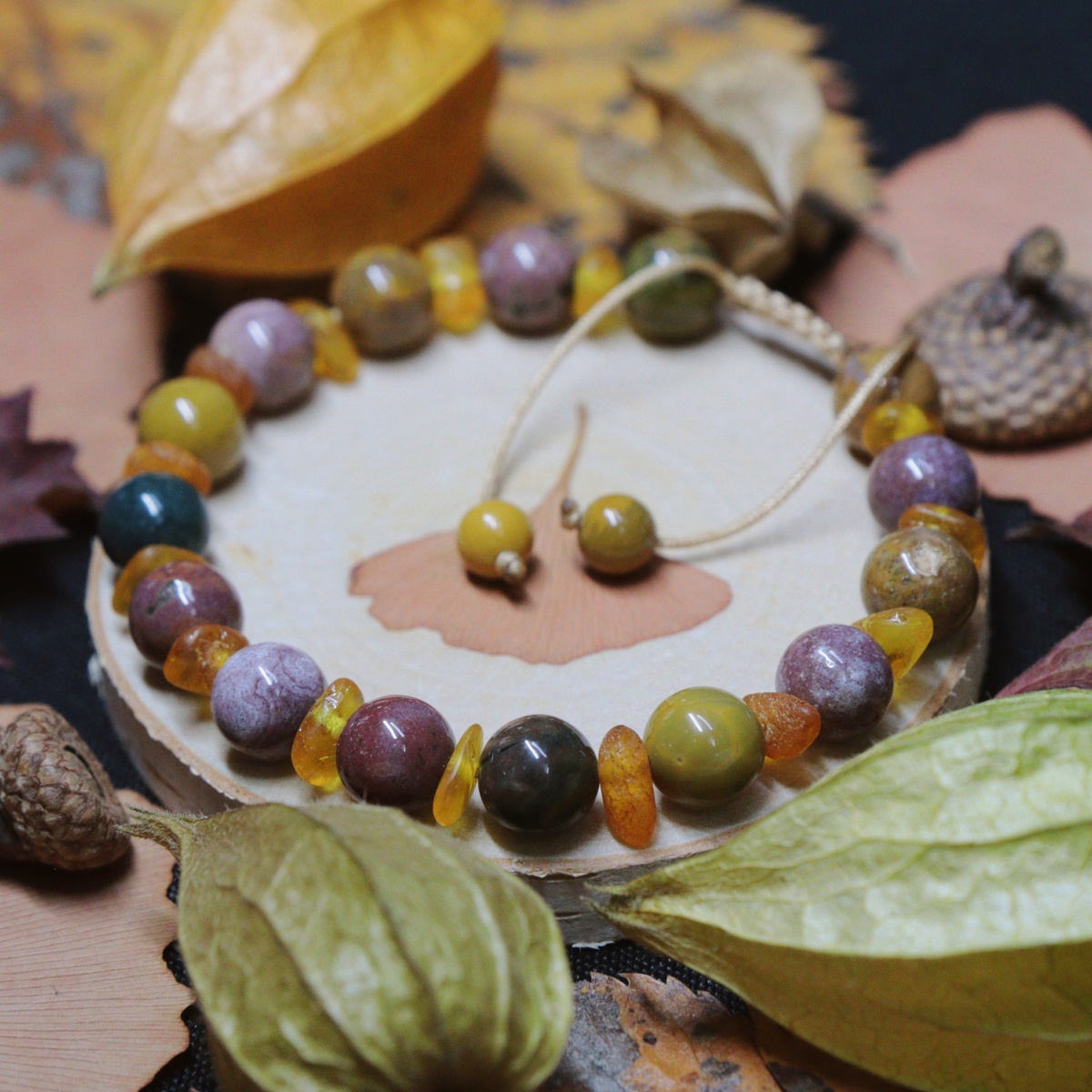 Приглушенные тона океанической яшмы хранят в себе нежность ранней теплой осени, шелковистые лепестки осенних цветов, краски листвы, меняющей цвет на осенний. Янтарные бусины свободной формы вносят яркие живые искорки, добавляя браслету радостное солнечное настроение, а также символизируют великолепие самого разгара осеннего сезона.