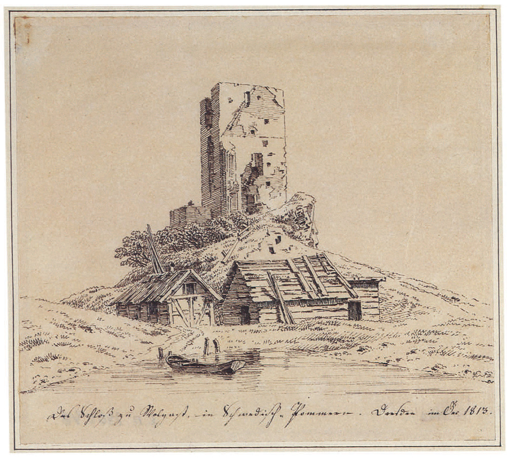 В 1813 году войска армии Наполеона вошли в Дрезден, и Каспару Давиду Фридриху (1774-1840) пришлось перебраться в Ибсаннштайнгебирге, горный регион к юго-востоку от Дрездена, чтобы переждать оккупацию. Для художника это было время серьёзных финансовых и эмоциональных трудностей. Вероятней всего, он мало работал, поскольку от 1813 года сохранилось лишь несколько работ, в основном на бумаге. Этот рисунок тушью, возможно, был частью запланированной, но нереализованной серии топографических видов исторических памятников. Поскольку Фридрих не ездил в Вольгаст в 1813 году, он, скорей всего, создал рисунок на основе более раннего натурного этюда. На рисунке изображена главная башня разрушенного герцогского замка Вольгаст XIV века, как будто увиденная и зарисованная с лодки, пришвартованной вдали от берега. Драматические руины соседствуют с крестьянскими хижинами (которые могли существовать, а могли и не существовать на самом деле) – особое сочетание, которое нравилось Фридриху и которое о