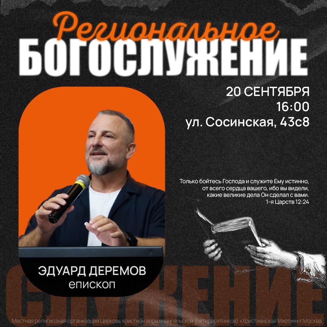 Сегодня жду вас на региональном богослужении в ЦХМ Москва. Мы соберёмся большой семьёй вместе с пасторами и лидерами городов нашего региона, чтобы поклоняться Богу, слышать живое Слово, укрепляться в вере и наполняться Его присутствием. В конце мы обязательно совершим Святое Причастие — это не просто обряд, а обновление Завета с Богом и друг с другом. Мы будем вспоминать жертву Иисуса Христа и принимать силу Его Крови для нашей жизни. 📍 20 сентября / 16:00 ул. Сосинская, 43с8 Трансляция богослужения: https://chm12.ru/live #цхм #цхммосква #епископдеремов #вера #видение #послушание #церковь #молодежноеслужение