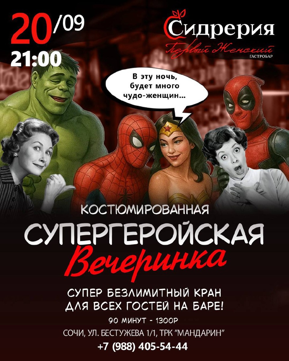🦸♀️🦸♂️ Супергеройская костюмированная вечеринка в Сидрерии! 📅 20 сентября | 🕘 Сбор гостей в 21:00 Мы включаем СУПЕР БЕЗЛИМИТНЫЙ КРАН на баре, на 90 минут! Поверь, будет очень мноооого Чудо-женщин! 😆 🤍 Приходи в костюме супергероя и получай -50% на сидр. (наш персонал тоже будет в образах! 😍) Где еще встретишь Человеков-Пауков, Женщин кошек и Халка? Правильно - только у нас! ⚡️ Этому городу нужны герои... Не упусти шанс спасти Адлер! Позвонить в Дейли Бьюгл на счет столика: ➡️+7 (988) 405-54-44 🤍Сочи, ул. Бестужева 1/1, РК «Мандарин» 🤍Написать Бэтмену по вопросам сотрудничества: @oleg_groom