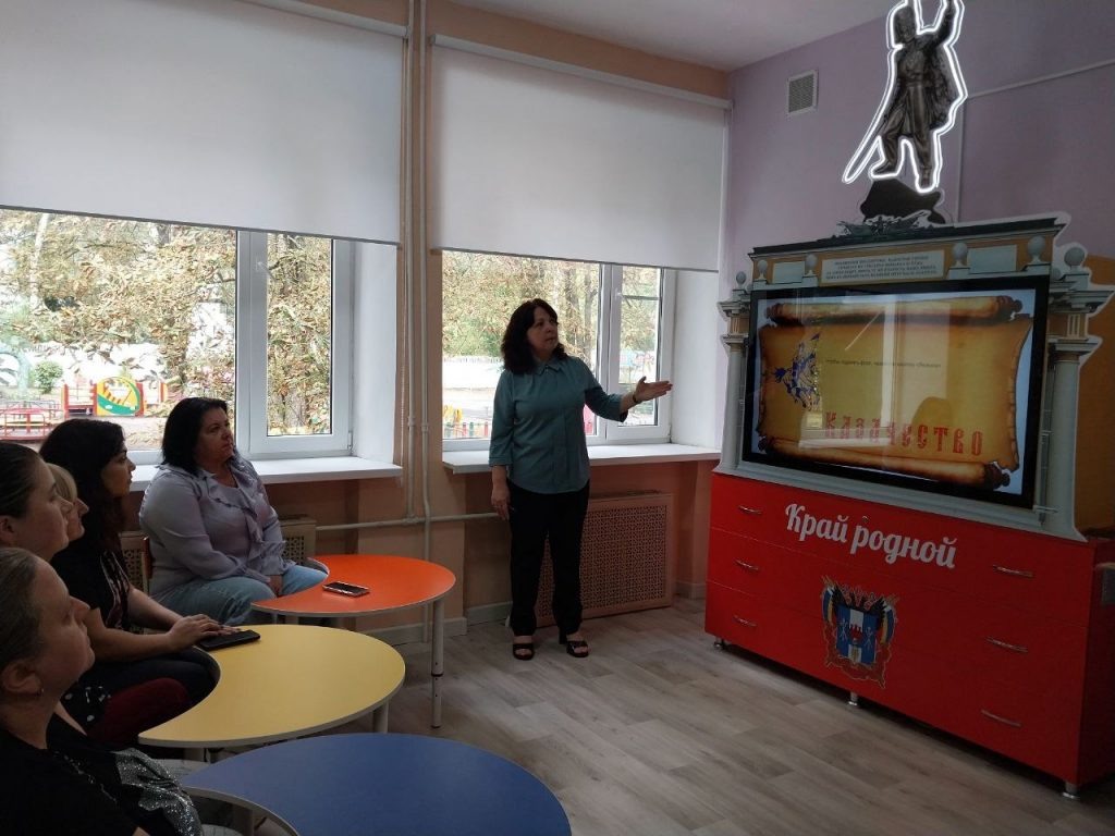 В муниципальном дошкольном учреждении №14 прошло очередное занятие школы педагога, посвящённое работе с новым интерактивным комплексом «Край родной». Оборудование приобретено в рамках реализации проекта по приобщению дошкольников к традициям донского казачества и направлено на поддержку Программы непрерывного казачьего образования в Ростовской области. Комплекс включает мультимедийные материалы, рассказывающие о жизни донских казаков — от воспитания детей и быта станиц до подвигов героев и истории крепостей. Завершают курс тематические викторины: о казачьем диалекте, национальной кухне, роли казака-защитника и других аспектах культуры. Они помогают детям закрепить знания и систематизировать полученные представления. Семинар начался с экскурсии в музейную комнату детского сада, где размещена «картинная галерея». Педагогам представили полотна, выполненные в разных техниках, но объединённые общей темой — быт и дом казаков. Картины помогают детям почувствовать красоту донской земли, величи