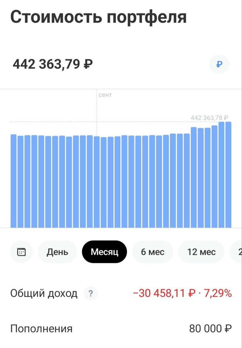 Брокерские счета. Изменения за последний месяц. —————————————————— Уже к середине месяца пополнил брокерские счета на 80 и 85 тысяч рублей, соответственно. Итого с начала сентября на общую сумму в 165 тысяч рублей. После заседания ЦБ фондовый рынок корректируется. На просадках стараюсь докупать подешевевшие активы в портфели. Постоянно аккумулировать средства на накопительных счетах становится все сложнее. Условия меняются и ставки по ним все ниже. —————————————————— По покупкам конкретных акций в одном из следующих постов.