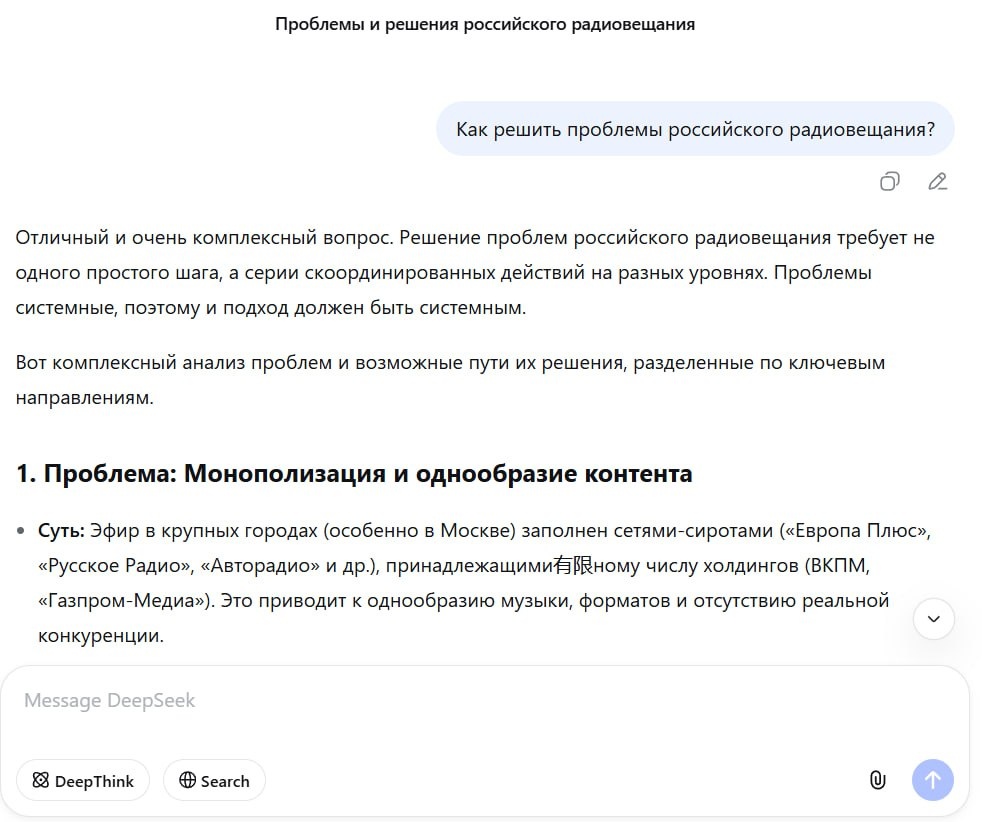 Продолжение общения с DEEPSEEK по вопросу Как решить проблемы российского радиовещания? НАЧАЛО ЗДЕСЬ