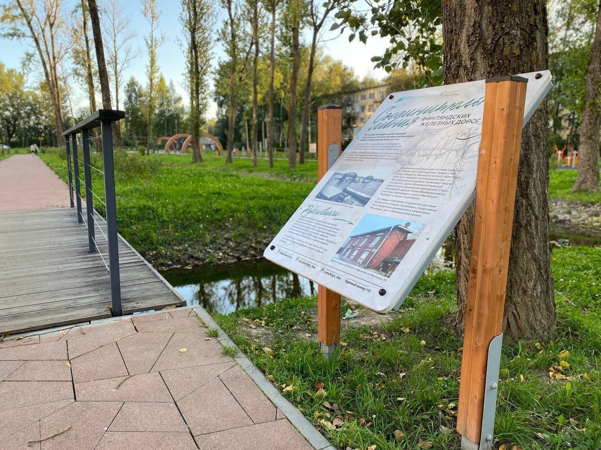 В Ириновском сквере установили новый информационный стенд, посвящённый соединительной линии Финляндских железных дорог