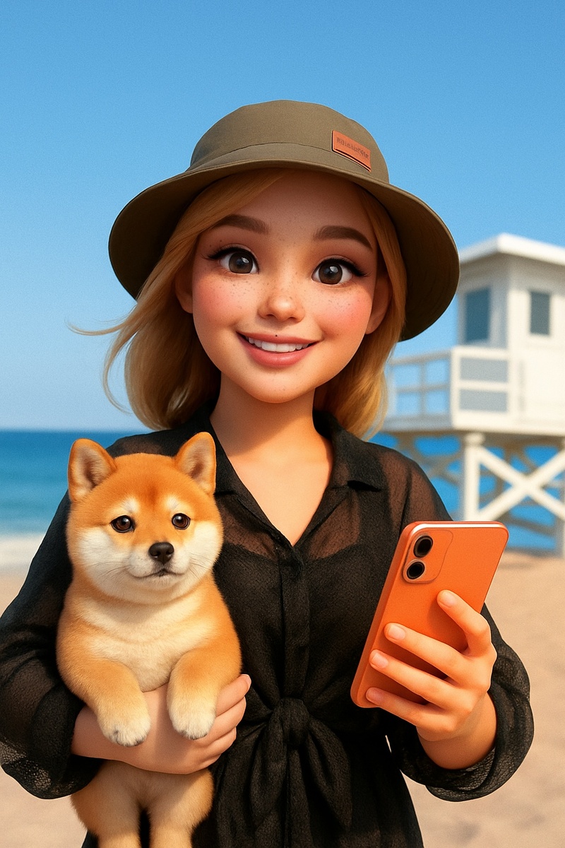 Сгенерируй 3D персонажа, как Барби по этой фотографии, сохранив все черты лица и внешнюю схожесть. Кукольный стиль, идеально ровные черты, блеск. Сделай персонажа милым и улыбающимся. Глаза карие, сделай меня подальше, чтоб я не держала телефон, а просто была в кадре по талию, держа телефон одной рукой, а во второй руке щенок сиба ину чуть пухловатая, совсем чучуть, фон мягкий и размытый - синее море и белый спасательный домик с лестницей как на американских пляжах.
