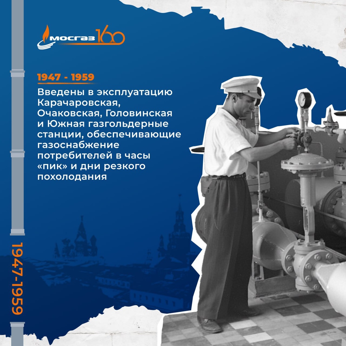 🔥Газовое хозяйство Москвы в послевоенные годы ⮕ В Москве сформировалась кольцевая схема газоснабжения с тремя ступенями давления. Построен кольцевой газопровод высокого давления диаметром 600 мм в районе Окружной железной дороги — дополнение к уже существующему кольцу среднего давления. Кроме того, сооружены распределительные лучевые газопроводы диаметром 300–400 мм с регуляторными станциями, которые обеспечивают подпитку газом всех уровней давления — высокого, среднего и низкого. ⮕ В период с 1947 по 1959 годы были введены в эксплуатацию Карачаровская, Очаковская, Головинская и Южная газгольдерные станции. Благодаря им газоснабжение надежно работало даже в часы «пик» и в самые холодные дни. #ГазовомуХозяйствуМосквы160 @aomosgaz