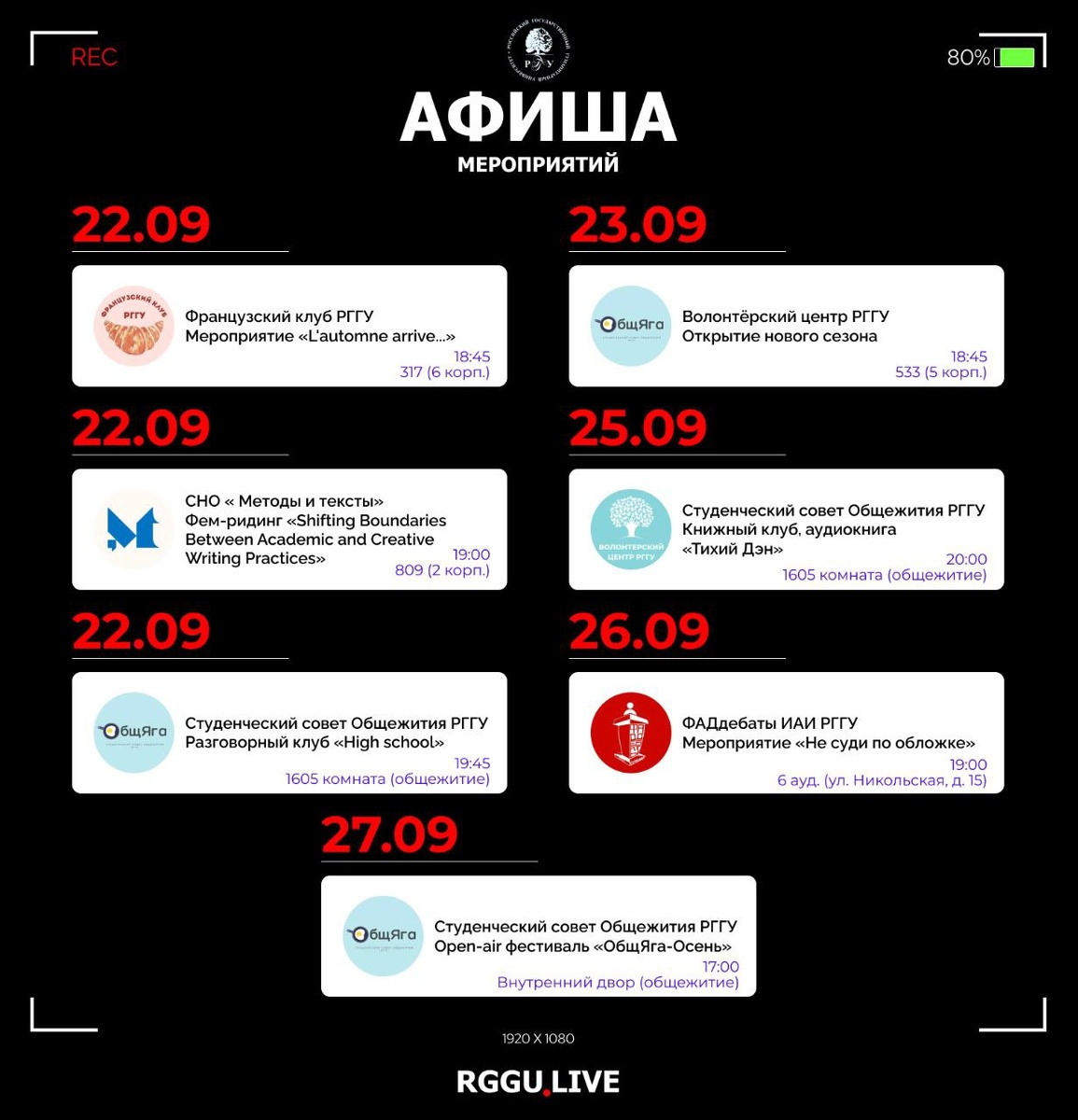 ΠΈΠΉ ΠΡΠ½Β» π 25.09/ 20:00/ 1605 ΠΊΠΎΠΌΠ½Π°ΡΠ° (ΡΠ». ΠΠΈΡΠΎΠ²ΠΎΠ³ΡΠ°Π΄ΡΠΊΠ°Ρ, Π΄. 25) ΠΠΎΠ΄ΡΠΎΠ±Π½Π΅Π΅ Π·Π΄Π΅ΡΡ π π’ Π€ΠΠΠ΄Π΅Π±Π°ΡΡ ΠΠΠ Π ΠΠΠ£ Π³ΠΎΡΠΎΠ²ΡΡ ΠΌΠ΅ΡΠΎΠΏΡΠΈΡΡΠΈΠ΅ Β«ΠΠ΅ ΡΡΠ΄ΠΈ ΠΏΠΎ ΠΎΠ±Π»ΠΎΠΆΠΊΠ΅Β» π 26.09/ 19:00/ 6 (ΡΠ». ΠΠΈΠΊΠΎΠ»ΡΡΠΊΠ°Ρ, Π΄. 15) ΠΠΎΠ΄ΡΠΎΠ±Π½Π΅Π΅ Π·Π΄Π΅ΡΡ π π’ Π‘ΡΡΠ΄Π΅Π½ΡΠ΅ΡΠΊΠΈΠΉ ΡΠΎΠ²Π΅Ρ ΠΠ±ΡΠ΅ΠΆΠΈΡΠΈΡ Π ΠΠΠ£ Π²Π½ΠΎΠ²Ρ Π·Π°ΠΏΡΡΠΊΠ°Π΅Ρ open-air ΡΠ΅ΡΡΠΈΠ²Π°Π»Ρ Β«ΠΠ±ΡΠ―Π³Π°-ΠΡΠ΅Π½ΡΒ» π 27.09/ 17:00/ Π²Π½