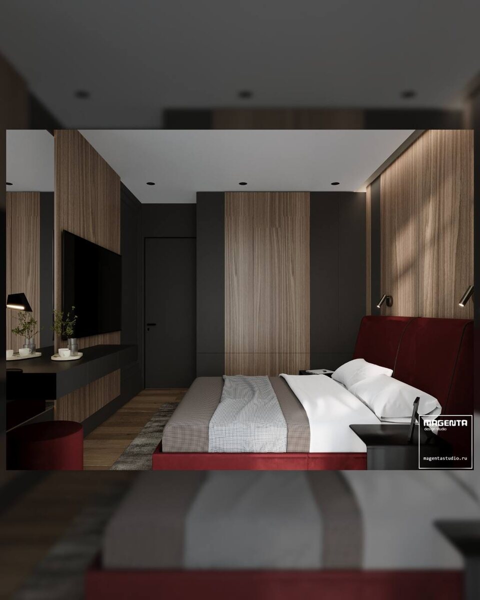 Эскизы спальни в ЖК «Оникс» — это пример того, как простые формы могут создавать искусство уюта. Тихая роскошь в трёх оттенках: тёплый шпон, графит и глубокий бордо. Парящая консоль, монолитная панель с ТВ и архитектурный свет собирают идеальную геометрию. Бархатное изголовье и фактурный серый текстиль — про тактильность и спокойствие. Сценарии продуманы от рассвета до поздней ночи: мягкая подсветка, скрытые системы хранения, ни одной лишней линии. Пространство, где темп города стихает, а статус звучит полутоном. Прикоснитесь к дизайну класса А: портфолио реализованных проектов — на сайте magentastudio.ru Magenta