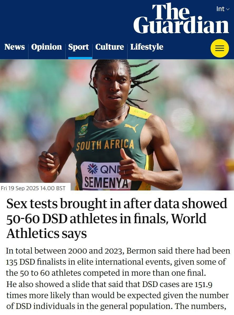 Спортсменки проходят обязательный генетический тест на половую принадлежность. Дело в том, что по данным Всемирной ассоциации легкой атлетики, за последние четверть века в финалах крупных турниров участвовало 135 спортсменок с мужским набором хромосом и мужскими половыми железами (проще говоря, яйцами), вырабатывающими тестостерон. А 50-60 таких спортсменок пробивались в финальную часть соревнований многократно. В среднем в легкой атлетике представленность этих «спортсменок» в 150 с лишним раз выше, чем в среднем в человеческой популяции. Самые яркие примеры – Кастер Семеня (золото Олимпийских Игр 2012 и 2014) и Кристин Мбома (серебро Игр-2020). Ну, про «боксершу» Иман Хелиф (золото Игр-2024) все в курсе.