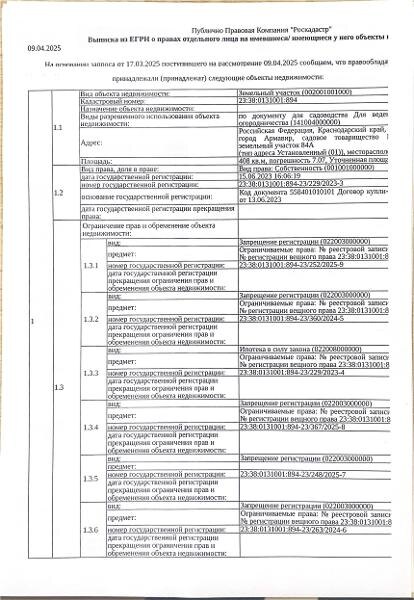 Название: Д-к: Павлов М.А. Земельный участок, площадь 408 кв.м., кадастровый номер 23:38:0131001:894, жилой дом, площадь 70,2 кв.м., кадастровый номер 23:38:0131001:898. Адрес: Краснодарский край, г. Армавир, СНТ «Кубань», проезд Великовечный, участок 84 А. Начальная цена 2 700 000 руб., задаток 2 700 руб., шаг аукциона 27 000 руб., ув. 1147 Канал: Госземля Краснодарский край Область: край Краснодарский г. Армавир Район: СНТ «Кубань» Населенный пункт: проезд Великовечный, участок 84 А Локация: Смотреть на карте ВРИ: Ведение садоводства Кадастровый номер: 23:38:0131001:894 Кадастровая стоимость: 211800.96 Вид сделки: Продажа Площадь: 408 м² Начальная цена: 2700000.00 руб. Дата завершения: 10.10.2025 Подробнее: ГИС ТОРГИ #госземля #земляотгосударства #земля #земельныйучасток #земельныеторги #торги #аукцион #продажаземли #продажа #краснодарскийкрай