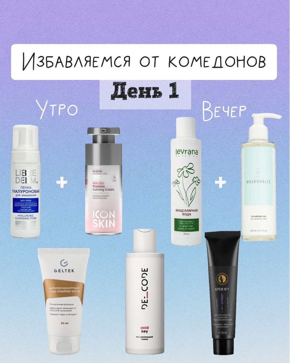 Переборщили с жирным кремушком или агрессивным очищением и получили кучу комедонов на лице? Как раз для этого случая подготовила уход на неделю. Для тех кого и комедоны заколебали (закрытые белые прыщики), и черные точки (они же открытые комедоны) не хочется наблюдать. Стремимся к чистым порам и гладкой коже День 1 стартуем с мягкой эксфолиации Утро: • Пенка/гель для умывания (с мягкими ПАВ, без сульфатов). Например: librederm пенка с гиалуронкой • Лёгкий крем-гель или эмульсия. Например увлажняющий Icon Skin re:biom • SPF флюидный обязательно. Например: Гельтек гель праймер SPF 30 Вечер: • Двойное очищение (гидрофильное масло/мицеллярка → умывание). Например: Мицеллярная вода Levrana с ромашкой + Maskoholic мягкий гель • Тоник с AHA (миндальная или молочная кислота 3-5%) растворяет мёртвые клетки, делает кожу мягче. Например Decode c АНА-кислотами • Крем с легкими увлажнителями (гиалуронка, глицерин). Например Мастерская Олеси Мустаевой крем N1 Это «чистый старт» для кожи: снимаем