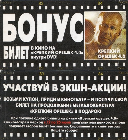 Из книги выпала закладка. 2007 год. На экраны выходит «Крепкий орешек 4» с нашим любимым Брюсом Уиллисом в главной роли. Другое время – всё еще эпоха DVD, уже произнесена мюнхенская речь Путина, но нет ещё войны – ни «малой», ни большой. Как использовать этот билет из прошлого? Может быть, найдётся какой-нибудь Док безумного вида, а с ним его друг Марти Макфлай, которым мы подарим этот билет. Они отправятся в прошлое на машине времени, сходят в кино на «Крепкий орешек 4», а главное, найдут врачей Брюса и учёных, расскажут им, что надо что-то делать – болезнь наступает. Ведь Брюс в «Двенадцати обезьянах» (1995) Терри Гиллиама уже спасал мир от болезни, теперь надо помочь ему. Ещё можно найти правильных людей в прошлом, в 2007 году и рассказать, что натворит Путин. Наверное, что-то можно будет сделать, чтобы будущее изменилось. Берите наш билет, новые Док и Марти Макфлай, отправляйтесь в прошлое – проснёмся мы завтра, а за окном мир и страна, свободная от путинщины. Итак, в путь! См. Наш