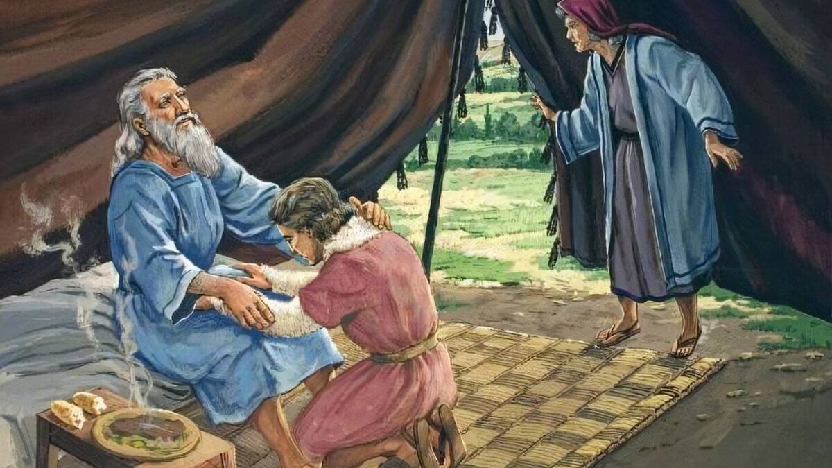 Эпизод №3.3. Получение Иаковом благословления отца Иаков получил шанс получить благословления отца, когда его мать Ревекка услышала, что Исаак собирается благословить своего любимого сына Исава. Она придумала, как, воспользовавшись слепотой Исаака, подменить Исава Иаковом. Она сказала Иакову (Бытие 27:8-10): «8 Слушай же меня внимательно, сын мой, и делай, как я тебе скажу. 9 Пойди к стаду и принеси мне двух лучших козлят, чтобы мне приготовить вкусную еду для твоего отца, такую, как он любит. 10 Потом отнеси ее отцу, он поест и благословит тебя перед смертью». Иаков возразил матери (Бытие 27:11-12): «11 Иаков сказал Ревекке, своей матери:
